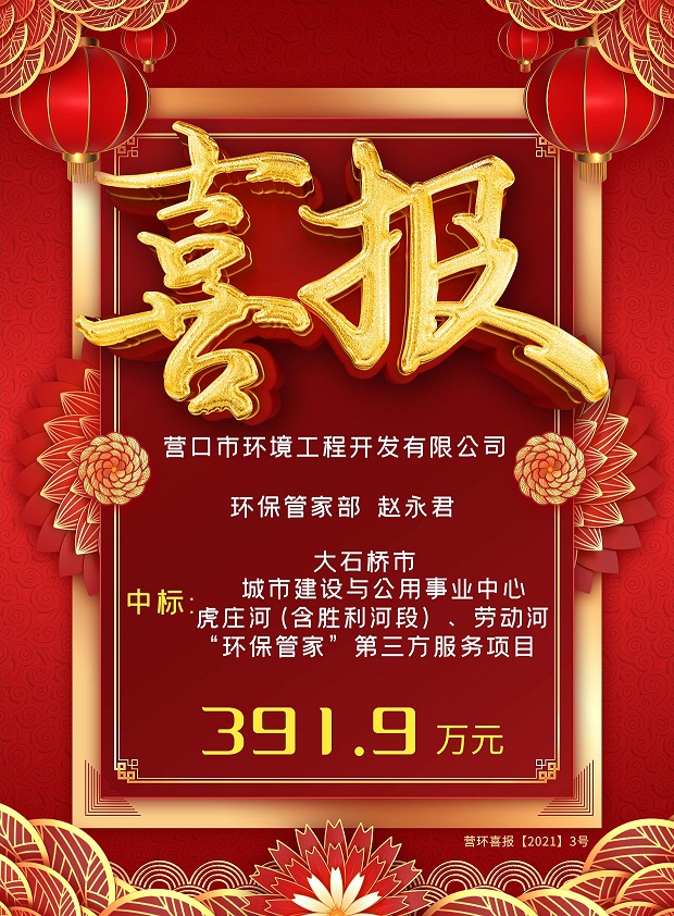 營口市環(huán)境工程開發(fā)有限公司中標大石橋市城市建設(shè)與公用事業(yè)中心虎莊河(含勝利河段)、勞動河“環(huán)保管家”第三方服務(wù)項目