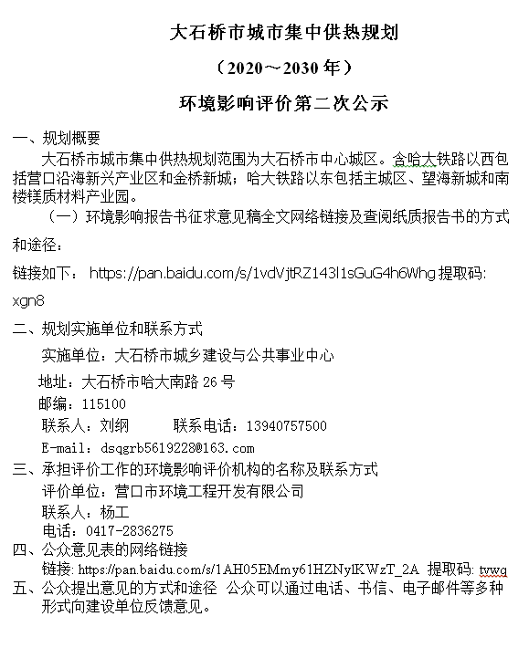 大石橋市城市集中供熱規(guī)劃 (2020~2030年) 環(huán)境影響評價第二次公示